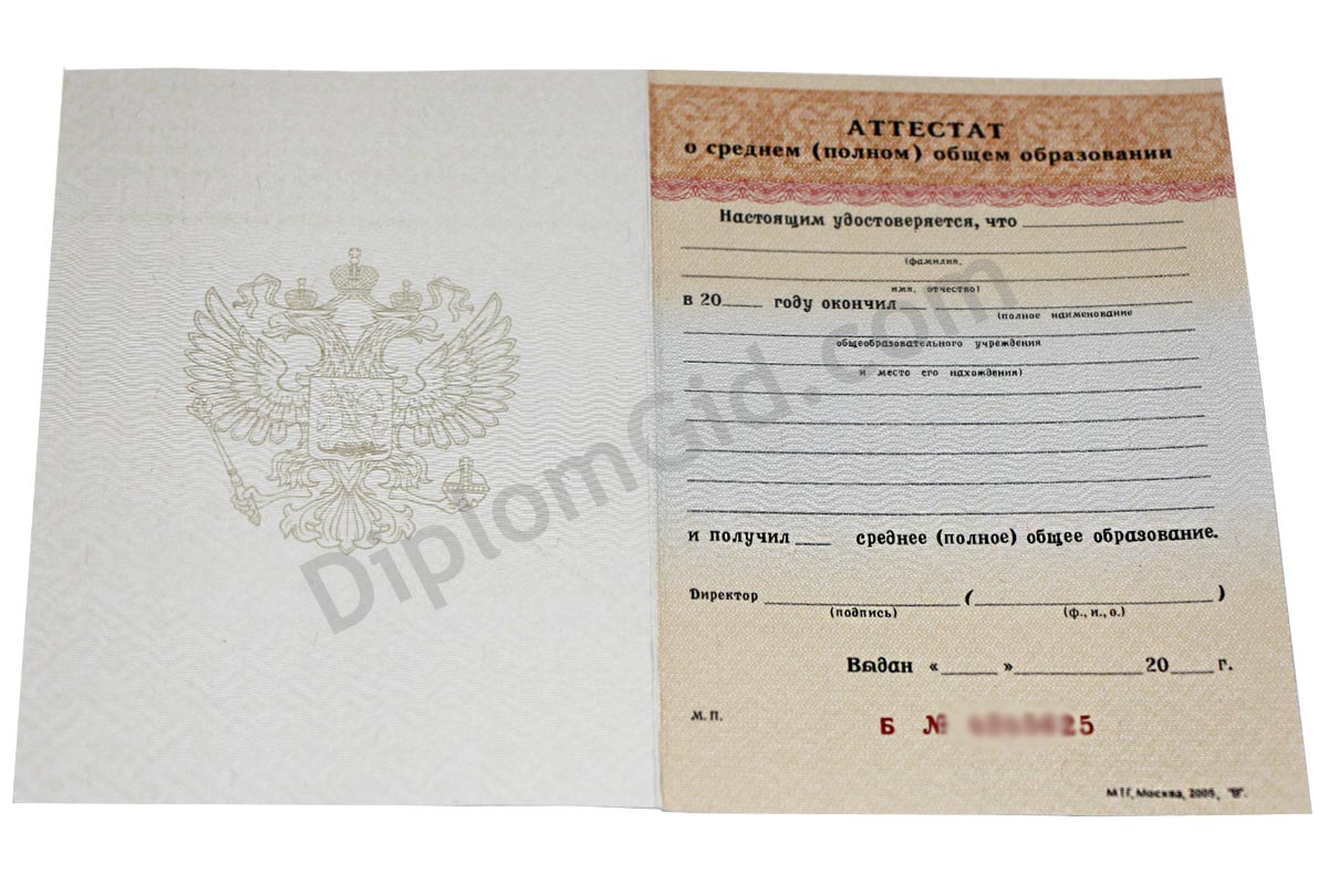 На нашем сайте Вы можете аттестат о среднем общем образовании (11 классов) без обучения, выданный любым школой Москвы и других городов России в период с 1994 по 2006 год. В комплект входит бланк, обложка и приложение, оформленные по всем стандартам.