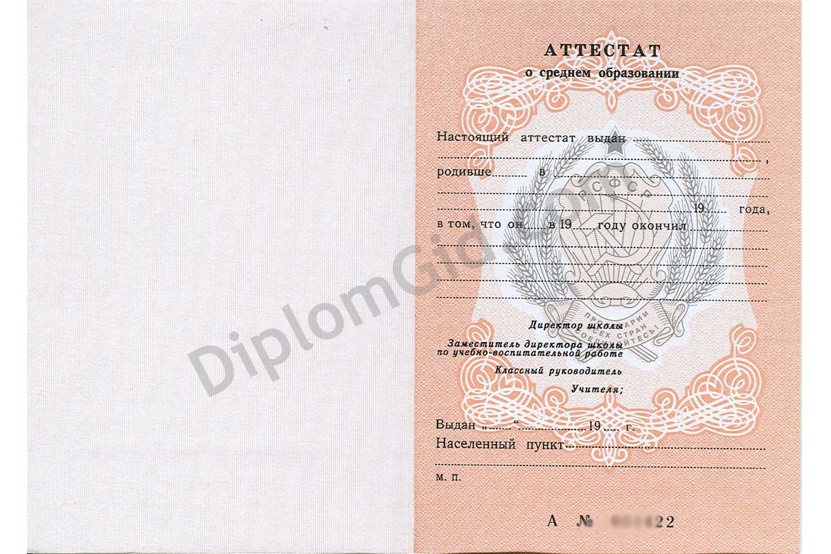 Аттестат школы об окончании 11 или 10 классов старого образца СССР с выдачей до 1994 года. Имеет советскую символику, заполняется по стандартам того времени, заверяется гербовой печатью РСФСР, подписью директора и других ответственных лиц. Аттестат как в школе!
